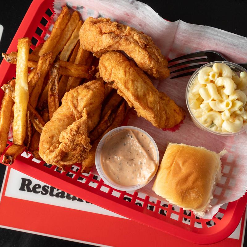 3 chicken strips, 2 sides, and a roll. Extra Strips $2.25