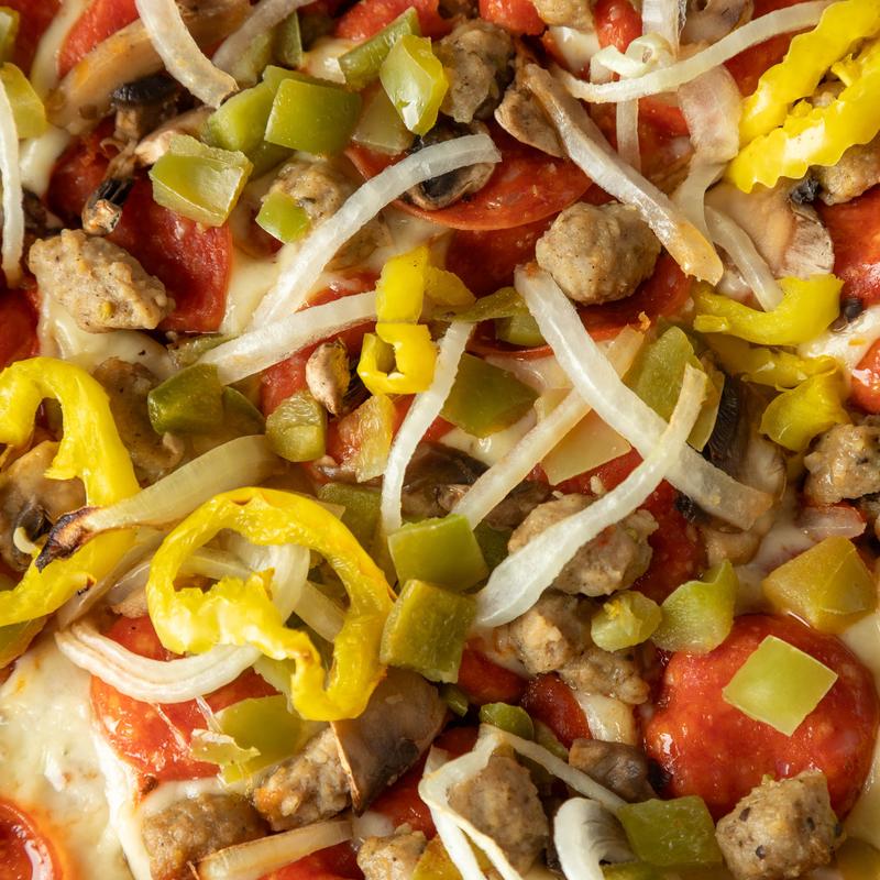 Pepperoni, sausage, mushrooms, green peppers, onions, and banana peppers