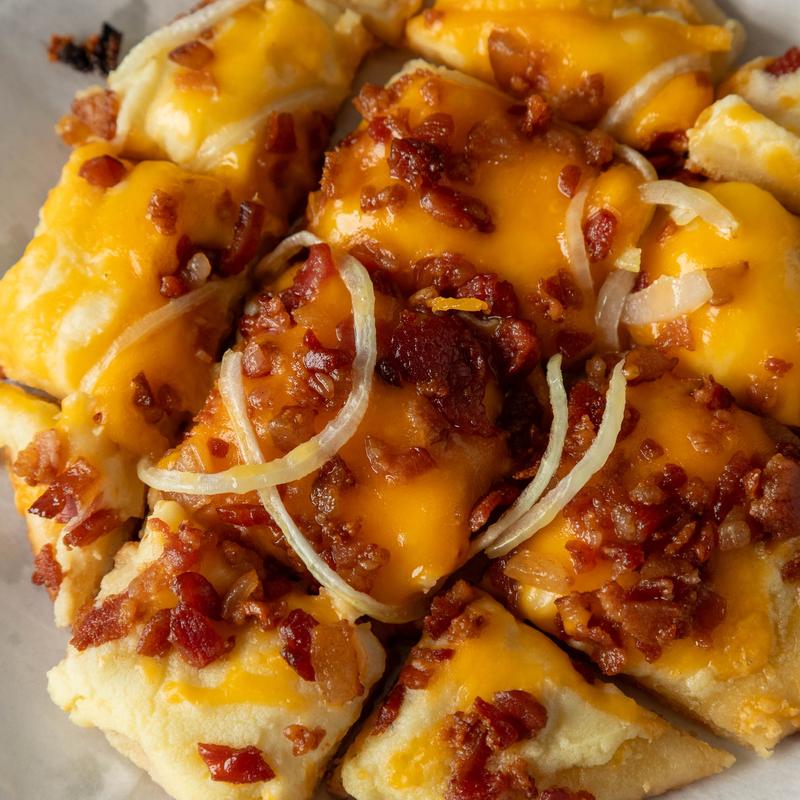 Crispy pizza topped with melted cheese, diced bacon, and thinly sliced onions on a savory potato base