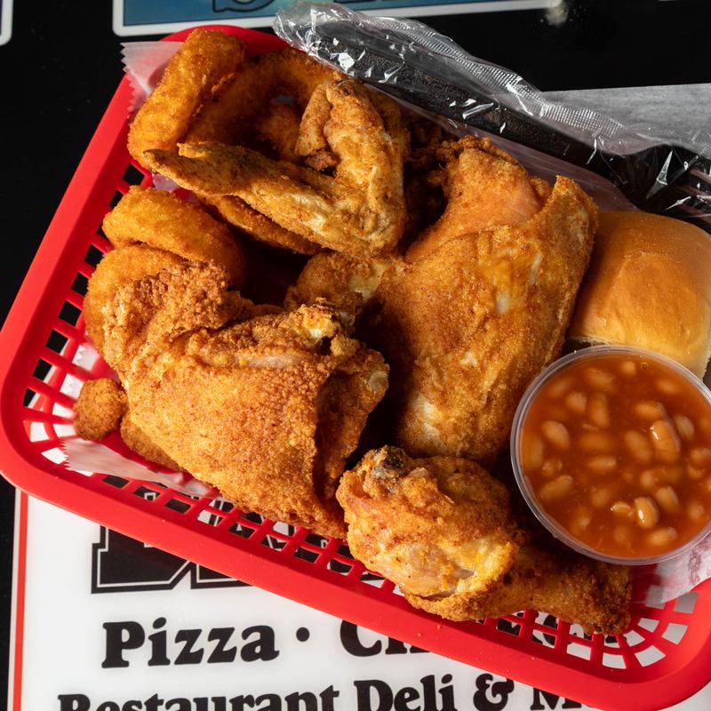 Breast, leg, thigh, wing, 2 sides, and a roll