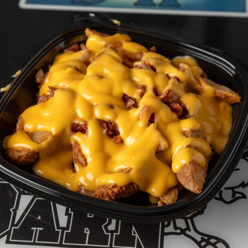 Mashed potatoes, bacon, onions, Cheddar cheese, and garlic butter, with sour cream