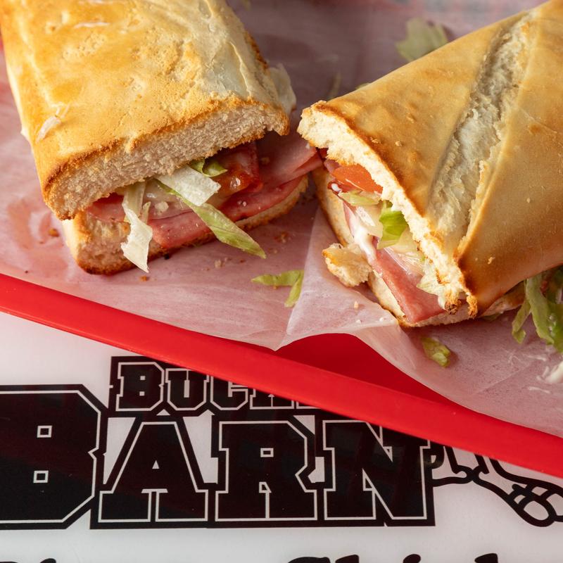 Boiled ham, chopped ham, salami, provolone, pizza sauce, onions, and banana peppers